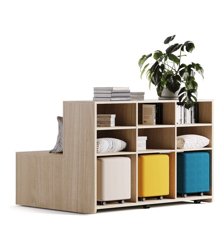 Its wheels and modular character make the collaborative work space more dynamic as a bench, platform, or shelf, incorporating integrated storage space that can be complemented with poufs.
