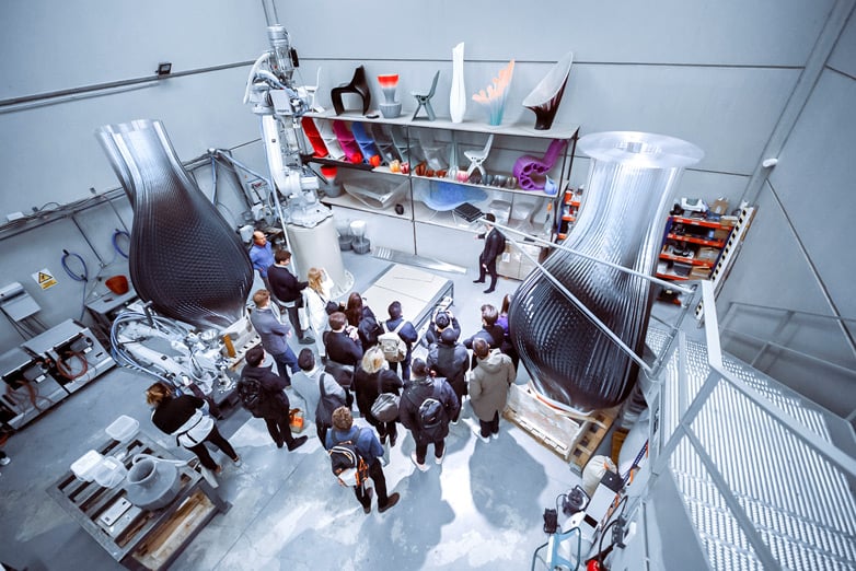 "What if we could work with a material that has unfortunately become limitless on our planet like plastic and is just waiting for a large-scale application to leave our ecosystem? What if we could extend this technology to print furniture, interiors or even buildings? We can now design objects that not only present unprecedented shapes, but also come together in novel ways to create larger structures. Even the most boring and unpleasant things, like bespoke public toilets for every event...", he pitched to the audience.