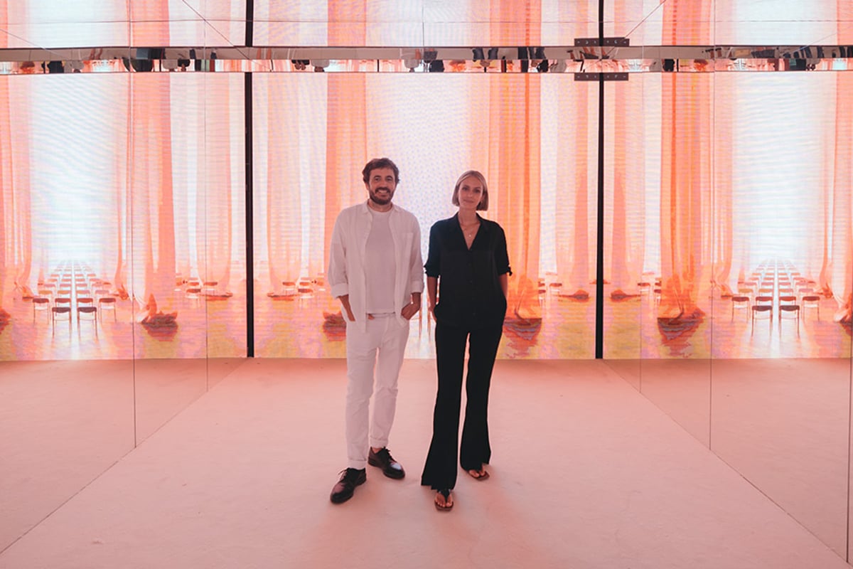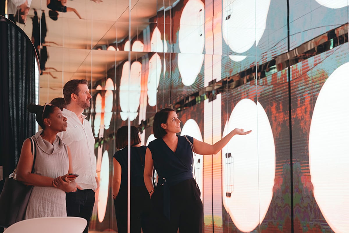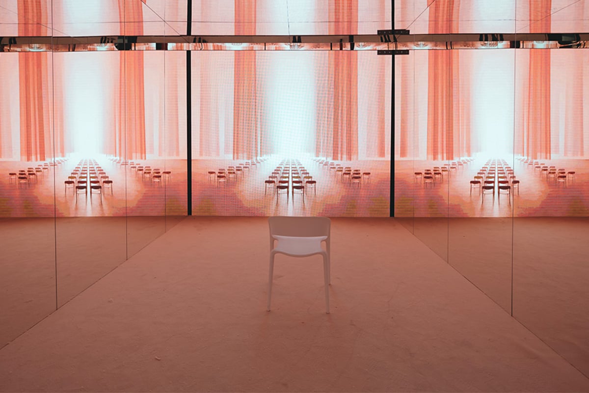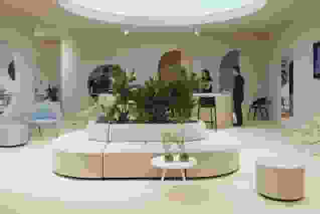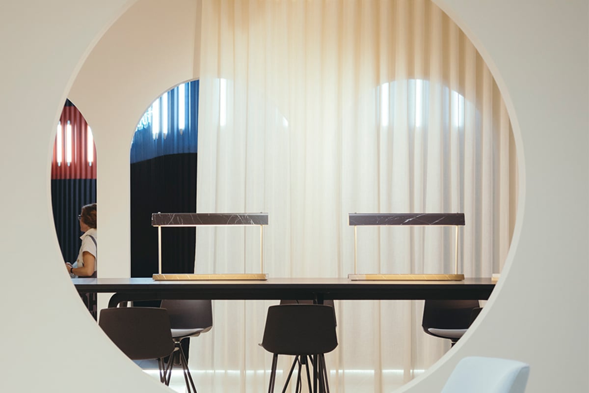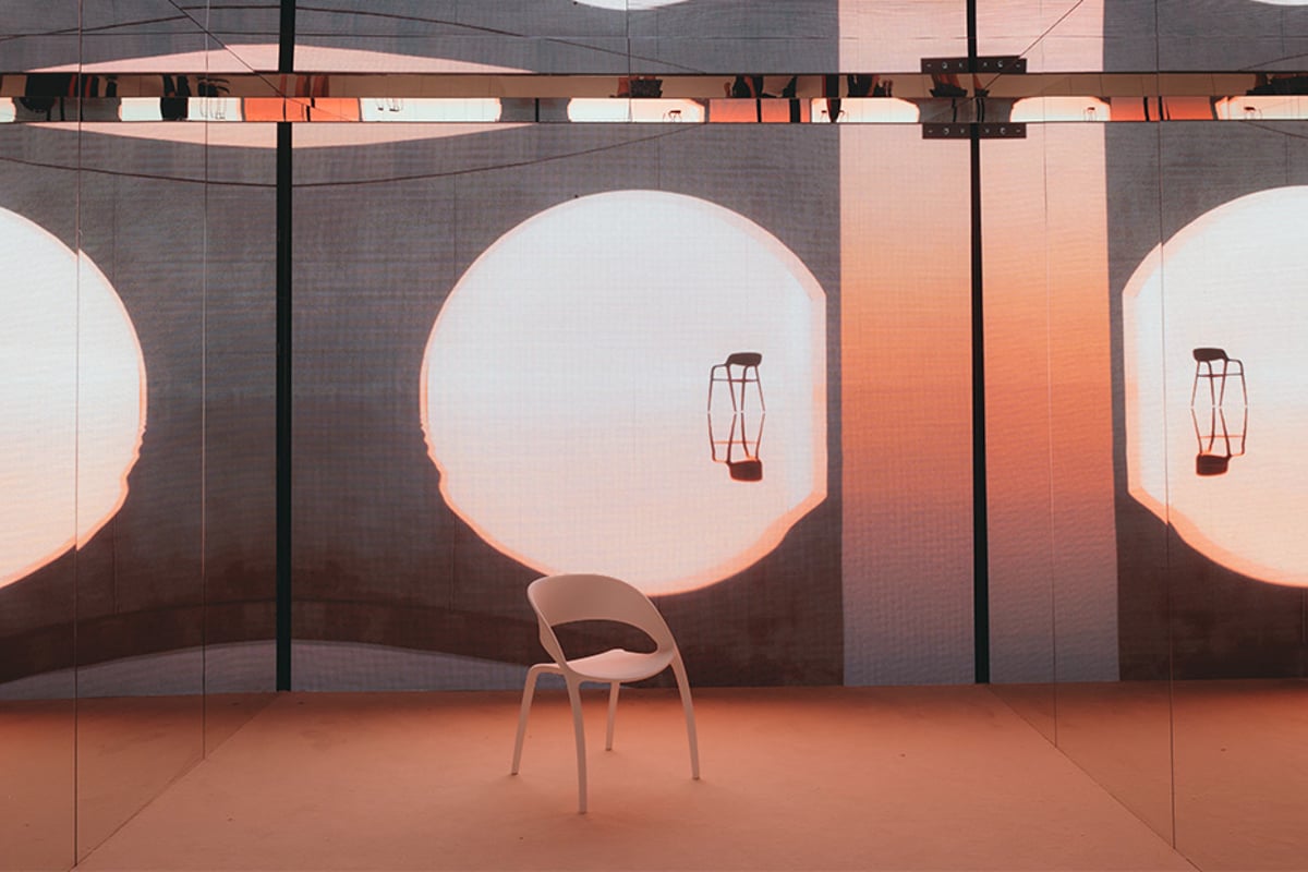 Two spaces have conveyed this philosophy of a hybrid world: on the one hand the stand designed by Isern Serra and on the other the infinity room co-designed by Isern Serra and Alba de la Fuente. Both spaces were built by Cosin Estudio. The stand, composed of comfortable and functional areas linked to the field of hospitality, and the Infinity Room that has immersed visitors in a digital art experience with the name "Heliophilia".