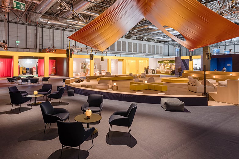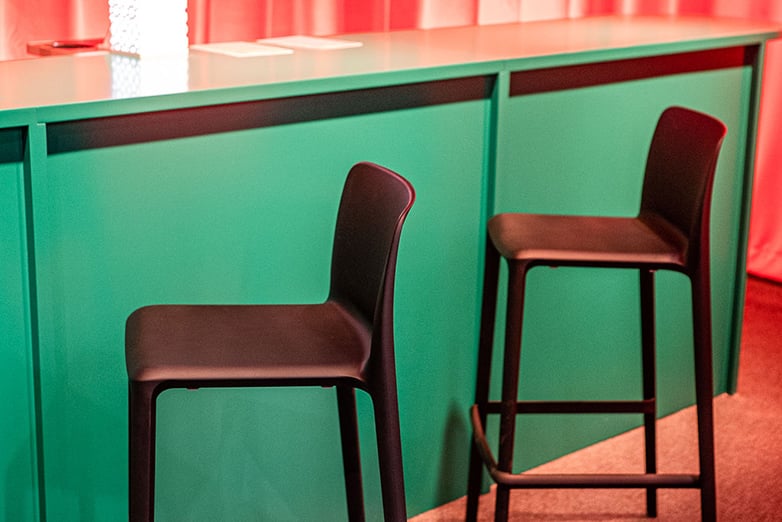 The interior design of the Guest Lounge (formerly the VIP Room) has created an atmosphere inspired by popular festivals as a representation of the collaboration, interaction, celebration and joy that characterises Mediterranean cultures. A culture that is in line with the values of Actiu, which has dressed the space with pieces from its Noom collections, designed by Alegre Design, Fluit high stools by Archirivolto Design and Tabula low tables, with which it creates hybrid spaces for connection and exchange of ideas.