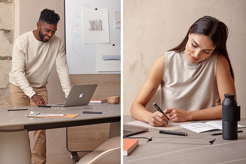Touch is directly connected to our sense of comfort. Sitting on an ergonomic chair that adapts to the body, working at an adjustable table or resting your hands on pleasant surfaces completely changes the work experience.