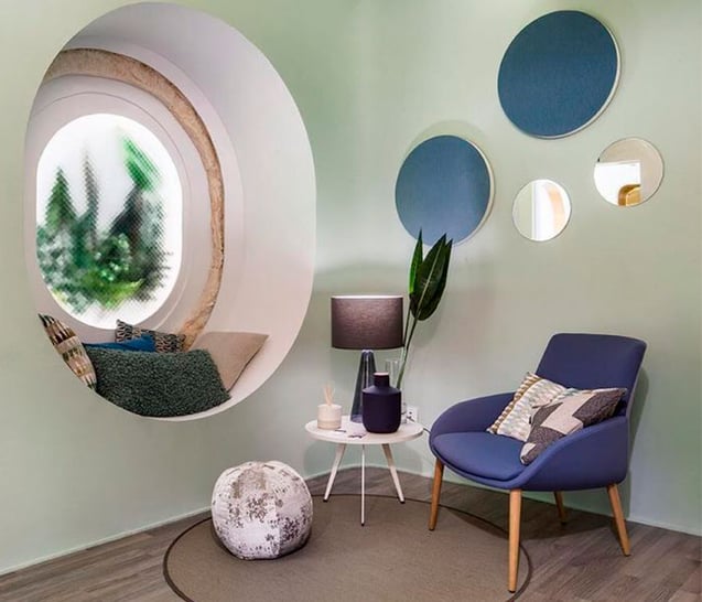 Converted into a place of relaxation and disconnection, The Secret Garden demonstrates how the ideal temperature, the absence of disturbing noises, good lighting and the use of appropriate colours are essential aspects in any home. The ESNE students used elements such as the curved seat or the corrugated roof, both built with Placo; the Ecophon acoustic ceiling, which improves the acoustics; or Isover glass wool, to ensure warmth. On a Weber continuous pavement and between glass that play with reflection and transparency, Noom and Bend from Actiu offer visitors a stop on their journey. Both brighten up a meeting and socialisation space in a personalised way that could be found either in a leisure environment, work space or in our own home. These two softseating ranges are inspired by their users, where functionality, comfort and design coexist.