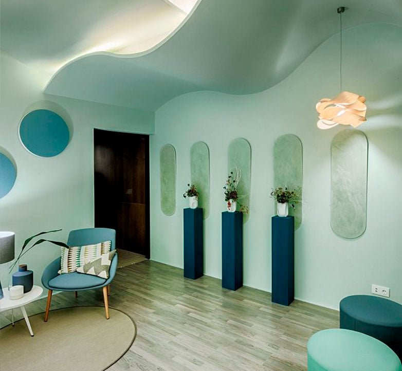 The warm and golden tones, the eternal binomial of white and black, and the décor elements are combined in this edition with a chromatic palette dominated by blue and green, broken only by saturated colours and pastel shades. State-of-the-art paints from Valentine, that incorporate healthy properties for both people and the environment. All this, immersed in a mix of impossible geometries and curved shapes, where materials such as stone, wood or marble stand out. Through fluffy and rigid surfaces, architects, designers and interior designers have built aesthetic, welcoming and functional environments. This combination of comfort and functionality gives great prominence to the senses without neglecting design. Creating space is not only what can be seen, but also what can be felt.