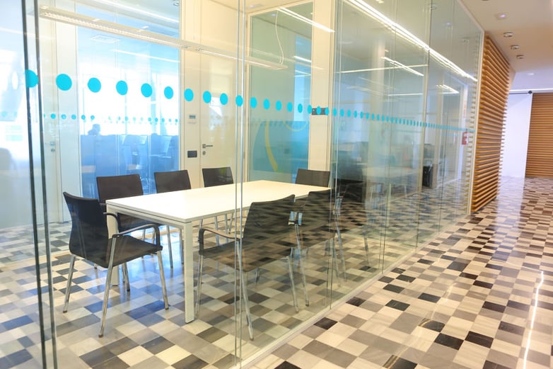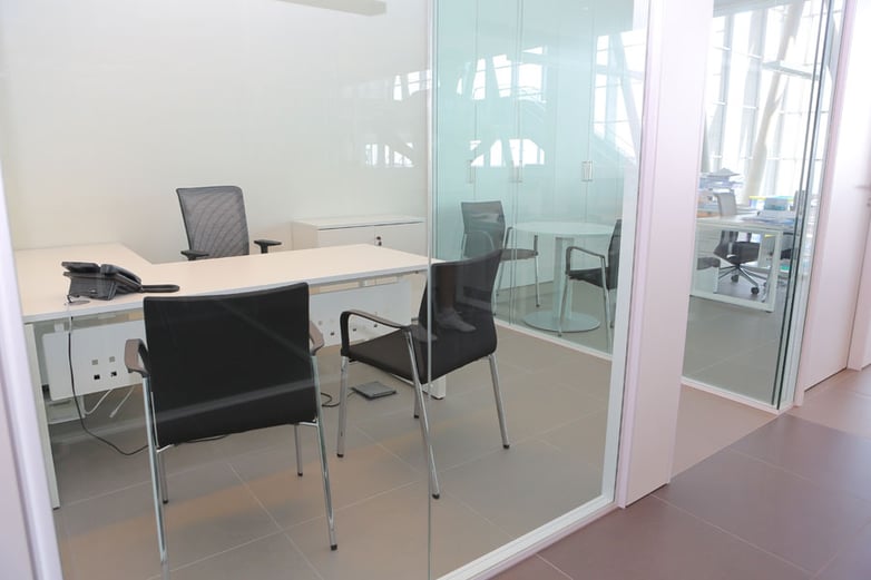 The meeting room, simple and light thanks to the glazing, is furnished with a straight desk from the Vital Plus ST program with top and legs in white and the Uma chair, in black, following the colour characteristics of the whole building.