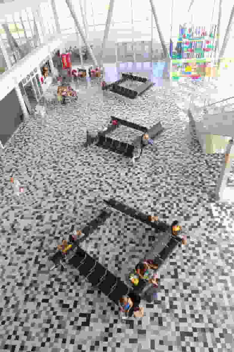 The bench, in black and metal, matches the mosaic paving, offers six seats in each one of the sides, plus an end table in aluminized steel sheet.