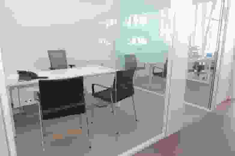 The meeting room, simple and light thanks to the glazing, is furnished with a straight desk from the Vital Plus ST program with top and legs in white and the Uma chair, in black, following the colour characteristics of the whole building.