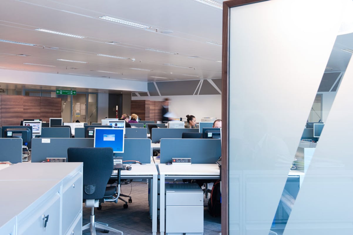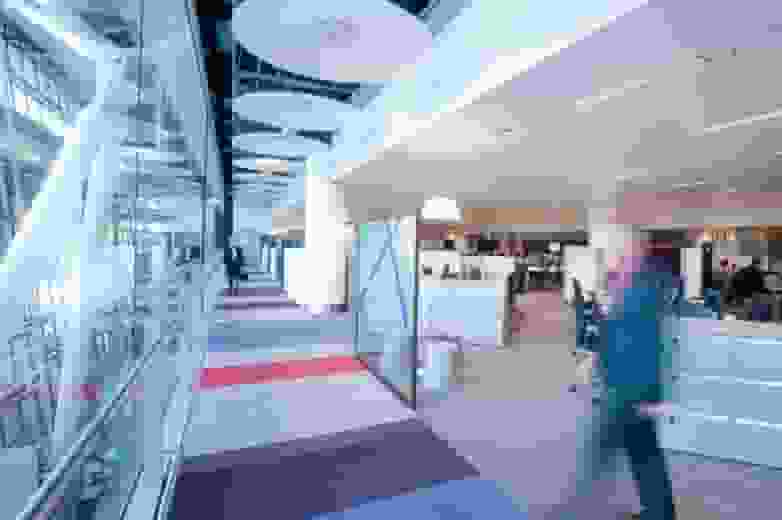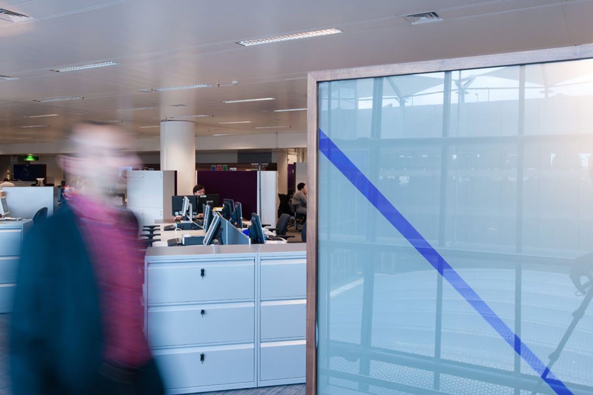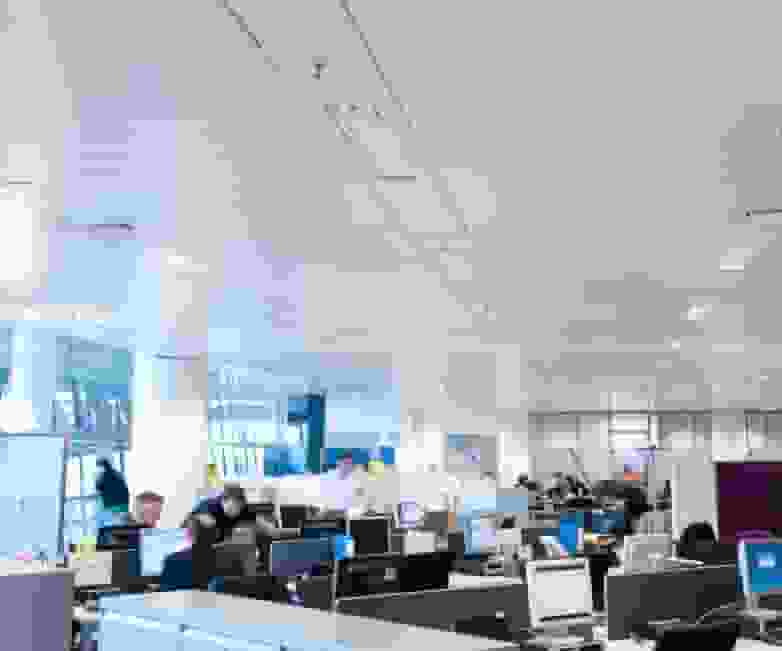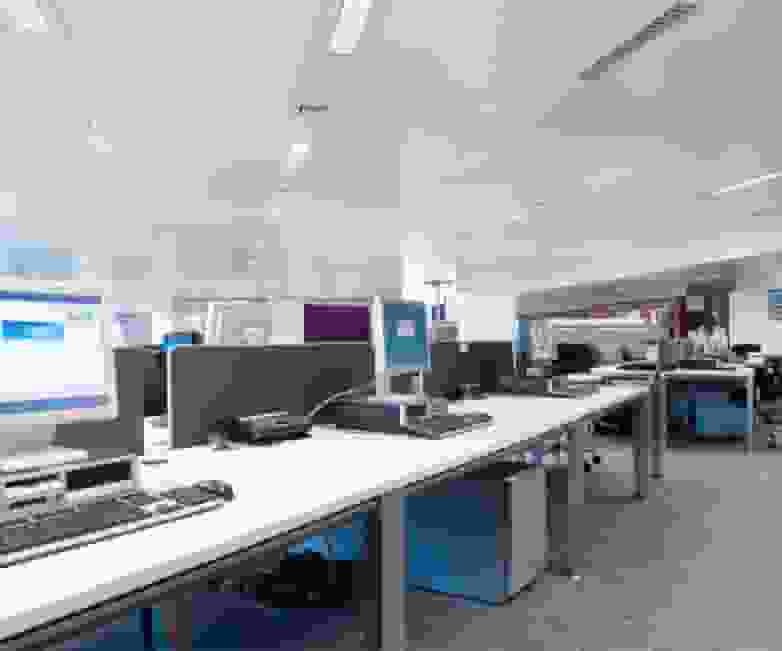 Each workstation is limited by a table top divider placed at the front part and upholstered in fabric. The gaps provide visual and functional benefits required for maintaining the privacy of each operational area but without being closed in.