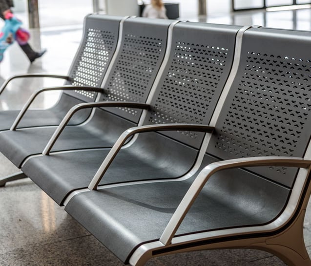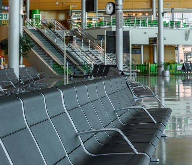 The Air Zone has been equipped with 1,300 benches with 4 seats and 900 with 5 seats made entirely of black polyurethane. They have armrests at the lateral ends but not in the middle, which allows passengers to lie down and rest comfortably if they have a long waiting time.