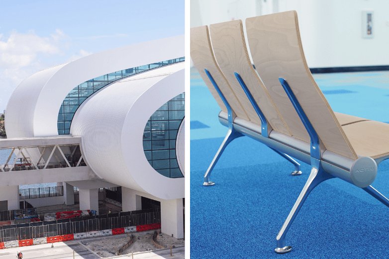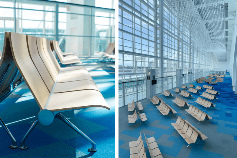 The interior is no less impressive, with a grand hall more than 11 storeys high that recreates the lobby of a ship. With steel columns and aluminium panels, its smooth finish is reminiscent of the surface of a pearl, while the carpeting in shades of blue recreates a cosy oceanic atmosphere. On it, and like small living organisms, the Avant benches by Actiu are distributed, with soft and ergonomic lines that ensure comfort while waiting. To enhance the connection with nature and thus improve the passenger experience, wood has been chosen for the seat and backrest, and no armrests or side tables have been added.