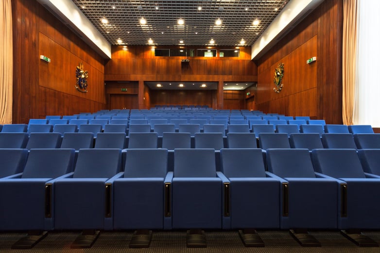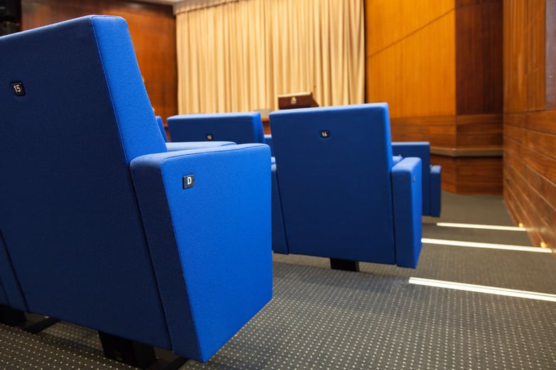 For this project a chair with a central foot has been chosen, anchored on a right angle, with a fire retardant upholstery in blue, numbered and with termination arms and with a row identifier incorporated to the side.