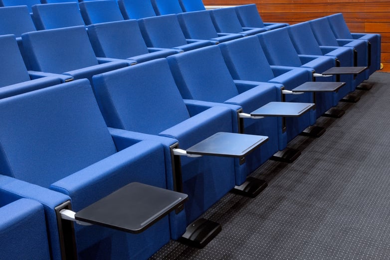 Furthermore, each seat incorporates a built in writing tablet which is hidden in the side of the armrest which it is folded.