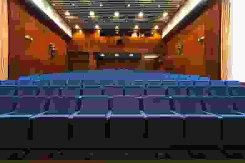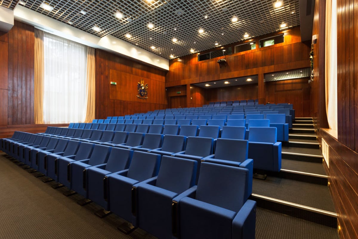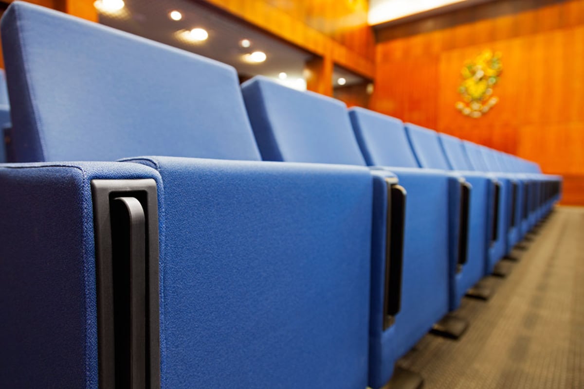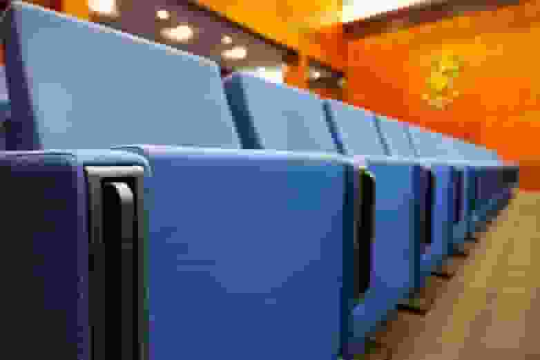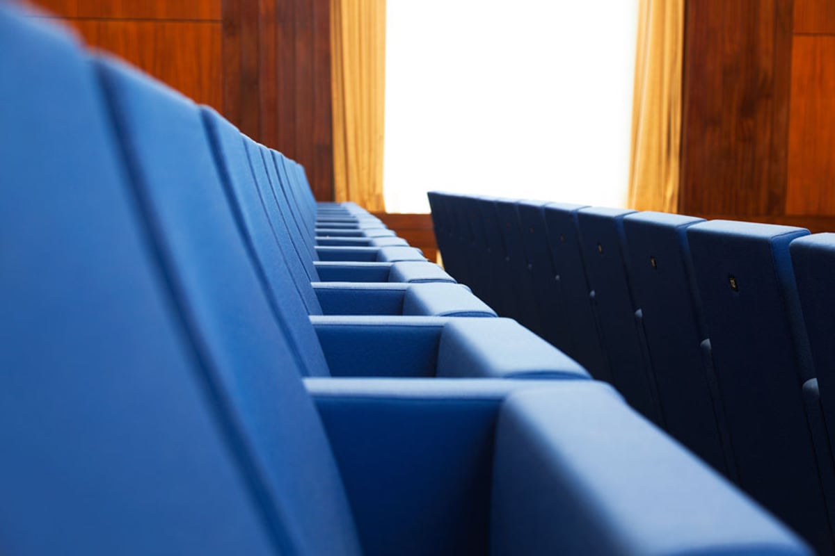 For this project a chair with a central foot has been chosen, anchored on a right angle, with a fire retardant upholstery in blue, numbered and with termination arms and with a row identifier incorporated to the side.