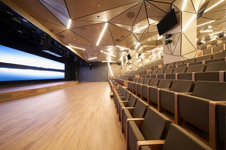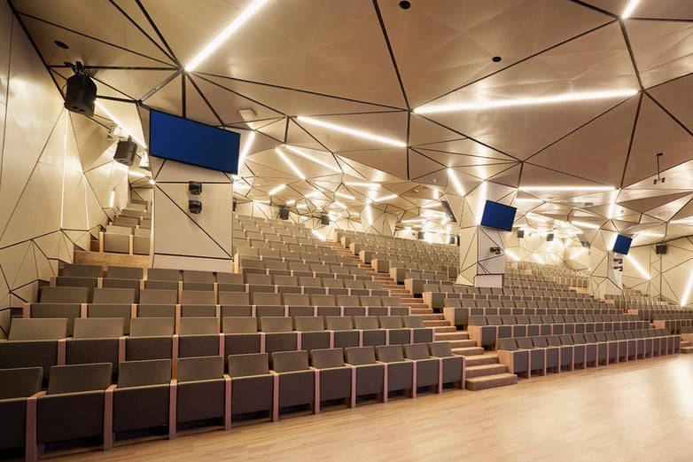 With an entrance from the vast atrium that is the height of 7 floors, the auditorium presides over and organises the flexible workspace now used by Sberbank. It is shrouded in a characteristic parametric frame that evokes a type of enormous origami. To create it, 1136 individual triangular acoustic panels cover the walls and ceiling of this huge multifunctional hall that has a capacity to hold 500 people. In addition, the three structural pillars support cutting-edge multimedia screens.