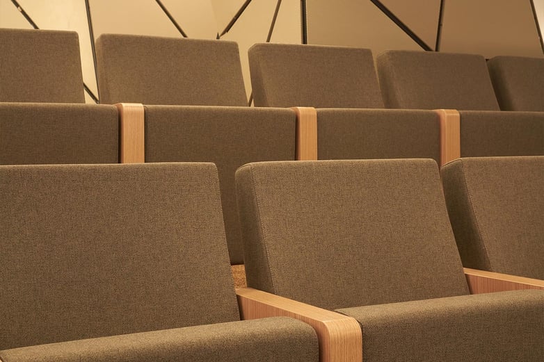 Alongside its partner in Moscow, Statio Project, Actiu has been involved in the design of the auditorium with its Audit 30 armchairs, designed by the R&D department and Alegre IndustrialTM. With minimalist, linear aesthetics and the ability to be reduced to a really compact size when not in use, its rectangularity adds a sense of order to the jagged outline of the casing. The wooden armrests, chosen to provide continuity to the flooring, are combined with ergonomic seats and backrests made from fire-resistant brown upholstery. The self-extinguishing polyurethane foam used to stuff the chair provides firm support and is very comfortable.