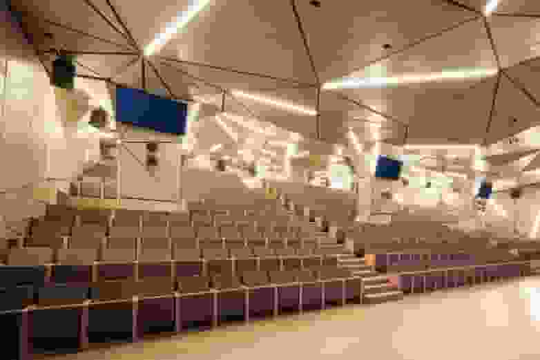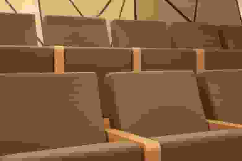 Alongside its partner in Moscow, Statio Project, Actiu has been involved in the design of the auditorium with its Audit 30 armchairs, designed by the R&D department and Alegre IndustrialTM. With minimalist, linear aesthetics and the ability to be reduced to a really compact size when not in use, its rectangularity adds a sense of order to the jagged outline of the casing. The wooden armrests, chosen to provide continuity to the flooring, are combined with ergonomic seats and backrests made from fire-resistant brown upholstery. The self-extinguishing polyurethane foam used to stuff the chair provides firm support and is very comfortable.