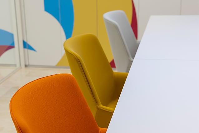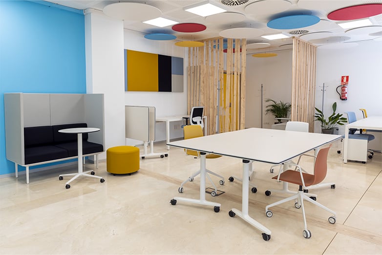 Mobile and static tables have been installed in the space. One for the fixed and continuous work stations and the other to encourage sharing and synergies between the different areas that make up the innovation centre. To make this mobility possible, chairs with wheels have been used so that they can be used in one or other area, depending on the moment or project.