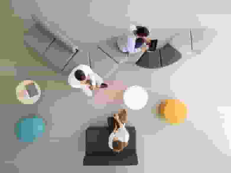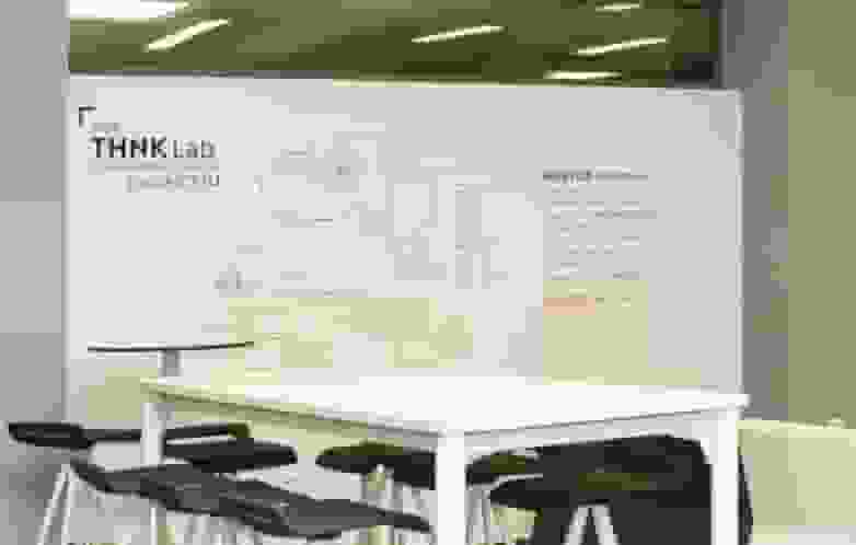 Collaborative area, creative thinking, project prototyping, team work, in which two types of tables have been installed, whilst both still possess the common feature of having large work surfaces. On the one hand, the Cool Meeting high table allows to work standing up or sitting on the Mit stools, also having the round Tábula tables, in this case designed to meet the needs of small teams. As a complement to this, the Prisma table combined with the versatile Wing seats offer an alternative for working together whilst sitting down.