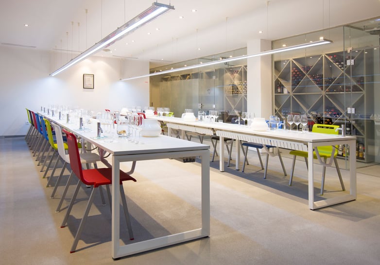 The school has two professional tasting rooms equipped to host official tastings and for which the table Vital Plus ST has been chosen, with a closed framed structure and white legs and with a wiring channel through the entire installation. The model chair Mit adds colour to the composition with its wide colour range.