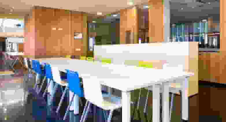 In the cafe they decided to create a fresh and functional atmosphere with the canteen tables being white and squared made of phenolic and with a round metal base. Mit presents here one of its multiple versions; the Mit stool, with aluminized steel legs and a chrome rim.