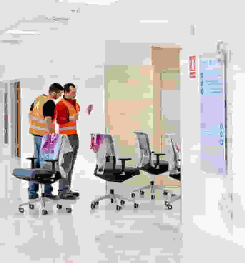 For communal areas that use workers from the hospital and meeting rooms, the program of desks Vital Plus have been selected again, because they offer the possibility to carry out multiple compositions. The Uma chair, with its discreet and elegant style, offers a various range of models suitable for different equipment needs.