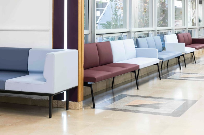 With a tubular steel structure and seat and backrest in flexible polyurethane injection foam upholstered in elegant shades of blue and maroon, Longo is durable and resistant to the wear and tear, use and intensive cleaning required in this type of environment, while guaranteeing a high level of hygiene.
