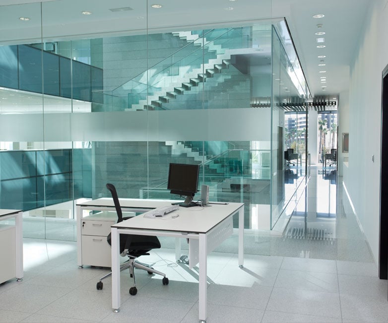 Glass, light and lightness are the main characteristics of the interior of the building. Therefore, after studying in detail the needs expressed for each of the areas, monochromatic equipment was proposed; white for all furniture and black for all seating, only breaking this trend for Ikara red chairs for the meeting rooms.