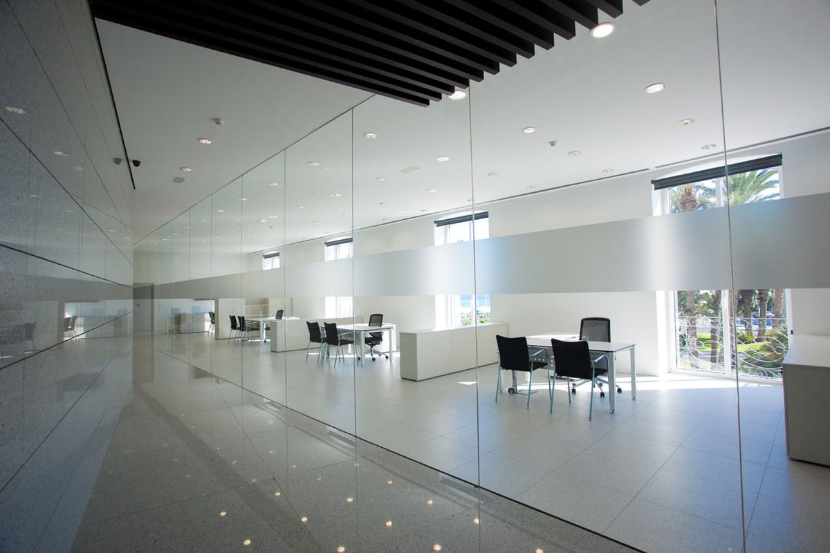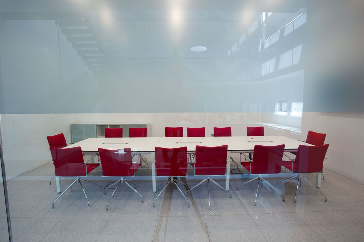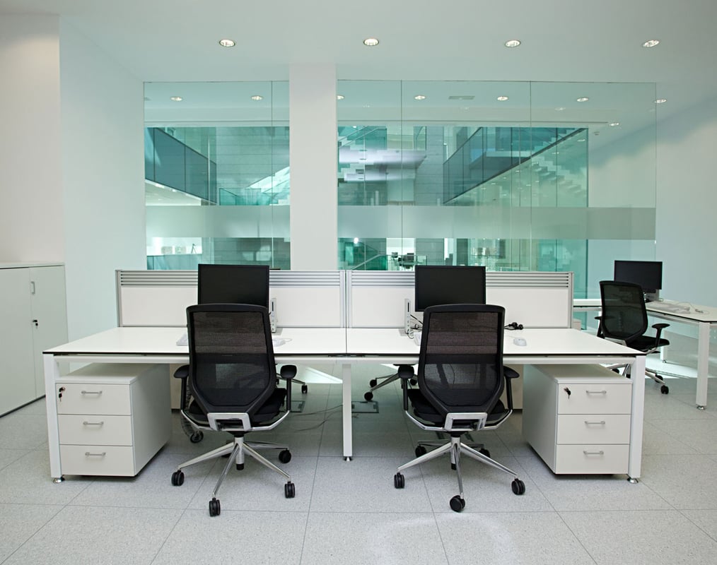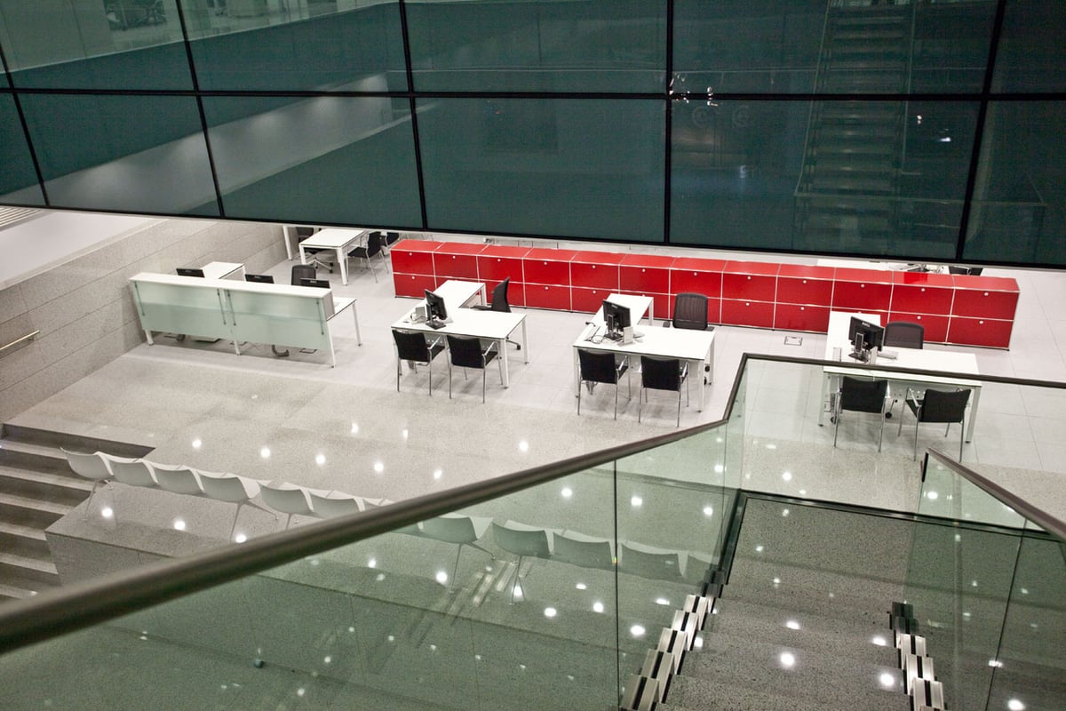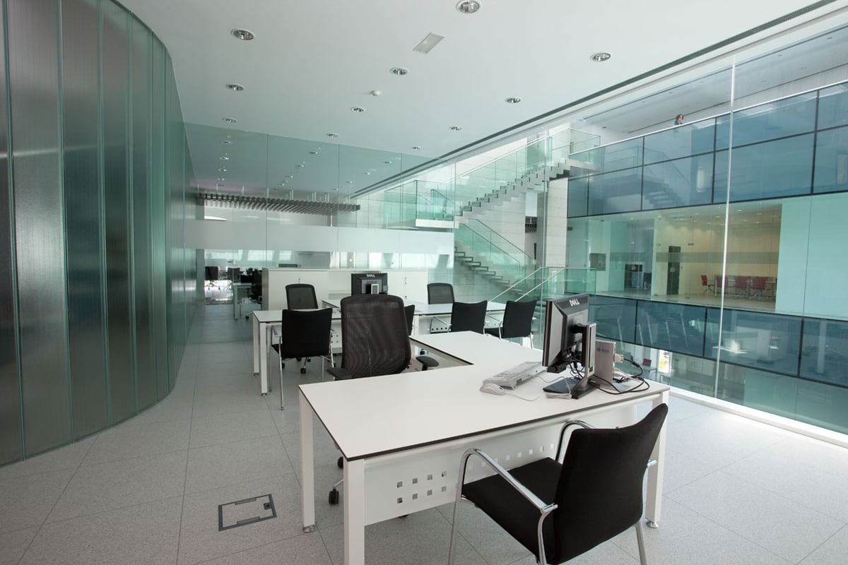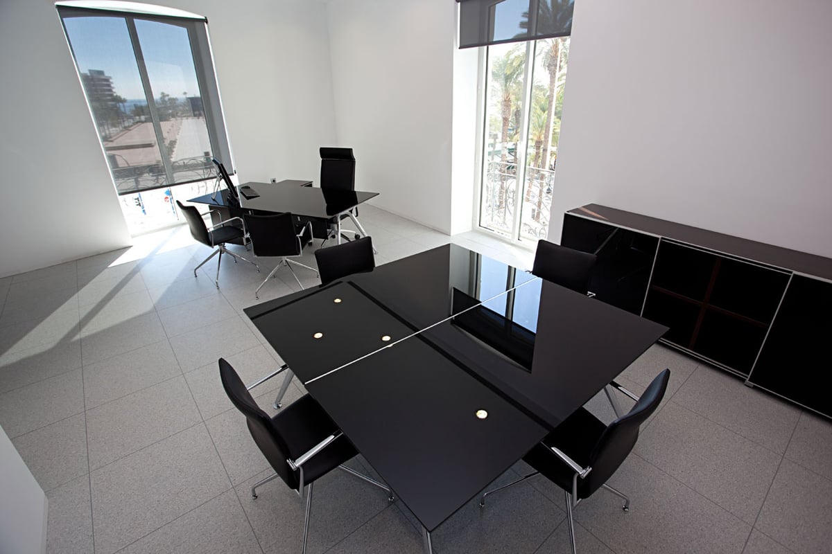 Glass, light and lightness are the main characteristics of the interior of the building. Therefore, after studying in detail the needs expressed for each of the areas, monochromatic equipment was proposed; white for all furniture and black for all seating, only breaking this trend for Ikara red chairs for the meeting rooms.