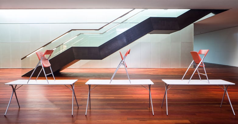 The combination of desks and folding chairs are for creating high performance configurations, dynamic and aesthetic, capable of integrating into public and communal spaces as well as for private use in the home.