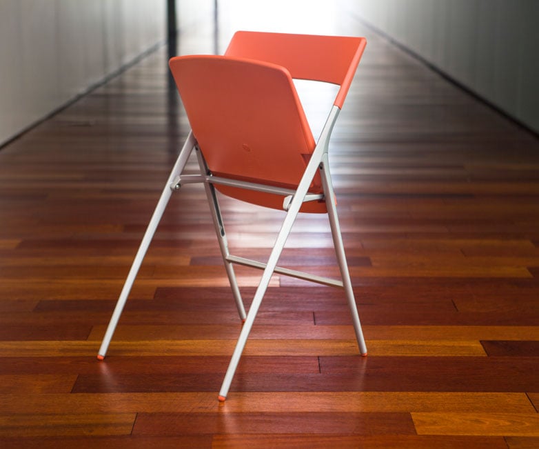 Plek reinvents the classic concept of folding chairs. Characterised by a very personal style of slender, continuous lines. Its light design, combined with fine materials such as cast iron for its structure, making it a unique piece in its range. They can be complemented with trolleys which enable the chairs and desks to be stored and transported easily. The Plek chair has been awarded The Red Dot Award for Design and Product of 2008 and selected for the Delta Awards 2009.