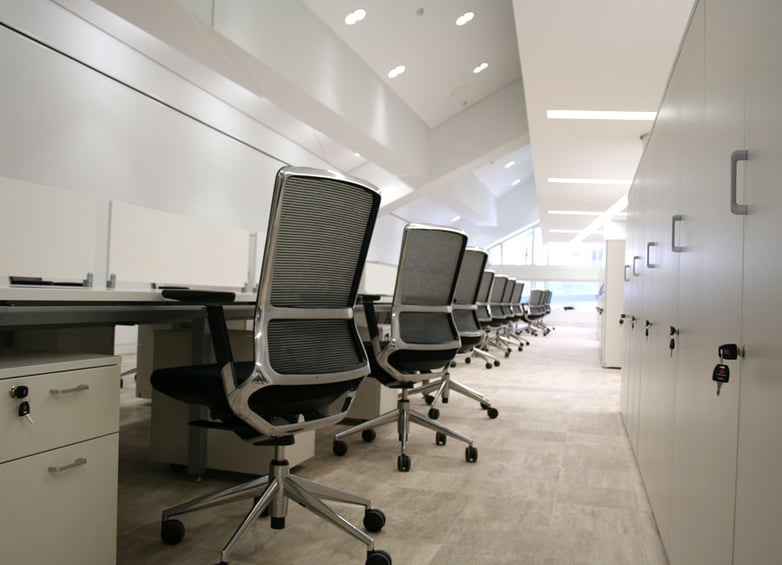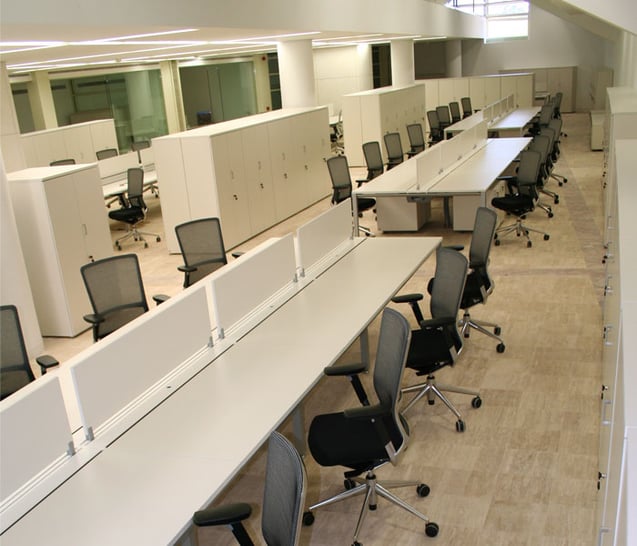 Two filing systems have been used; one using pedestals with castors for individual use which enables items to be kept within the touch of a hand. The other, modular cabinets, larger capacity and with options of various heights, enabling storage of all types of documents and office material.