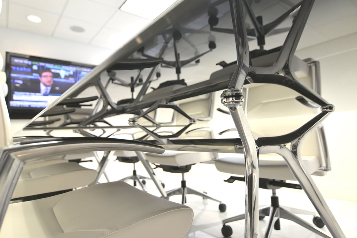 Arkitek meets an architectural vision of office equipment. Its most avant garde and representative side is demonstrated in the management desks and in the spacious meeting desks, as in this case. The lightness of the glass top, provides visual breadth to the space. A lightness that is favoured by the white of the Kados chairs.