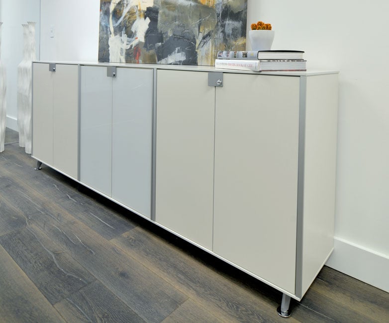 Another piece of furniture used to generate filing is the Block cabinet, in white and with a metal frame, to match the rest of the installation. The result is an office with elegant aesthetics achieved by a combination of furniture, materials and colours.