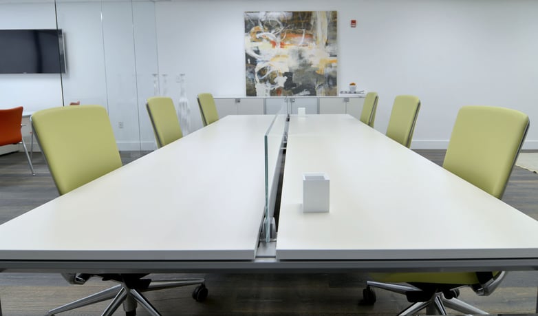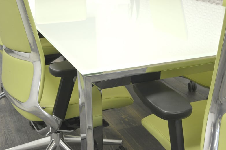 The meeting rooms are presided over by the elegant Vital Plus desk, with a finish in translucent glass for the top and chrome for the legs. Around this, are six TNK 500 chairs, upholstered in pistachio and with a metal structure visible on the back. A filing cabinet with glass doors, medium height, completes this room, belonging to the program of Modular cabinets.
