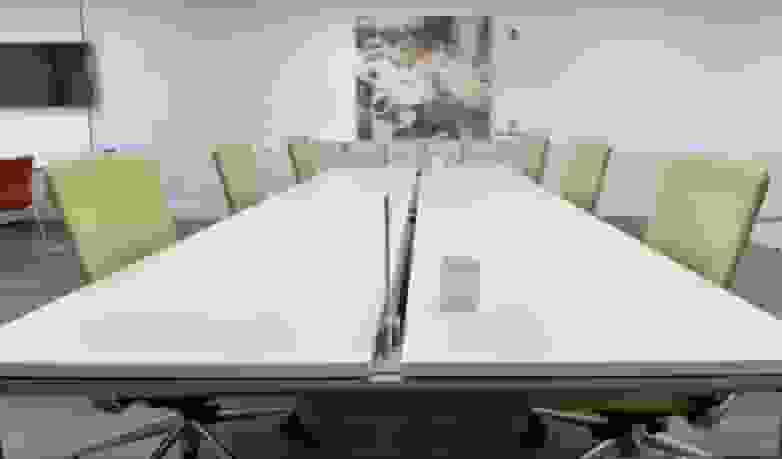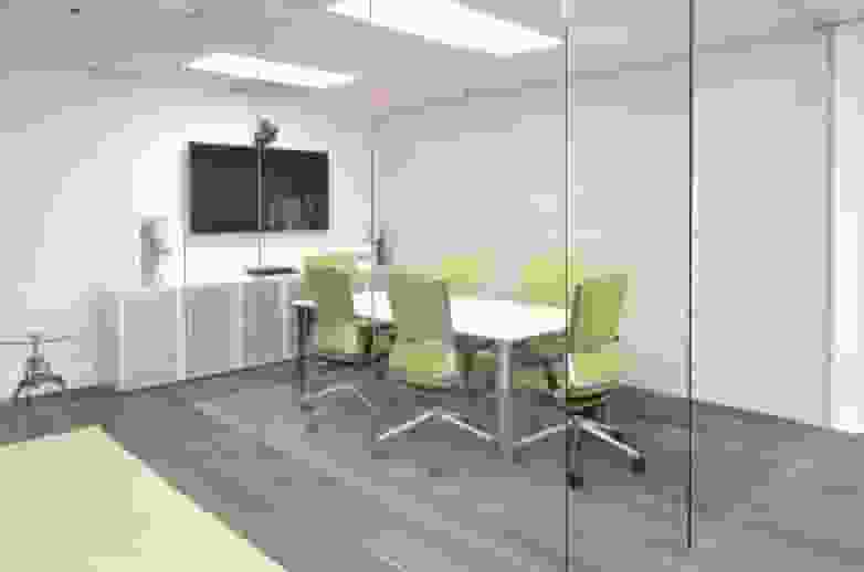 The meeting rooms are presided over by the elegant Vital Plus desk, with a finish in translucent glass for the top and chrome for the legs. Around this, are six TNK 500 chairs, upholstered in pistachio and with a metal structure visible on the back. A filing cabinet with glass doors, medium height, completes this room, belonging to the program of Modular cabinets.