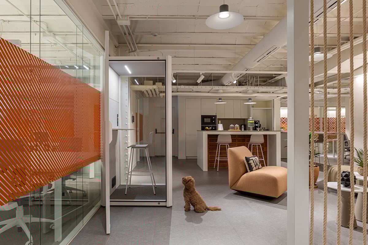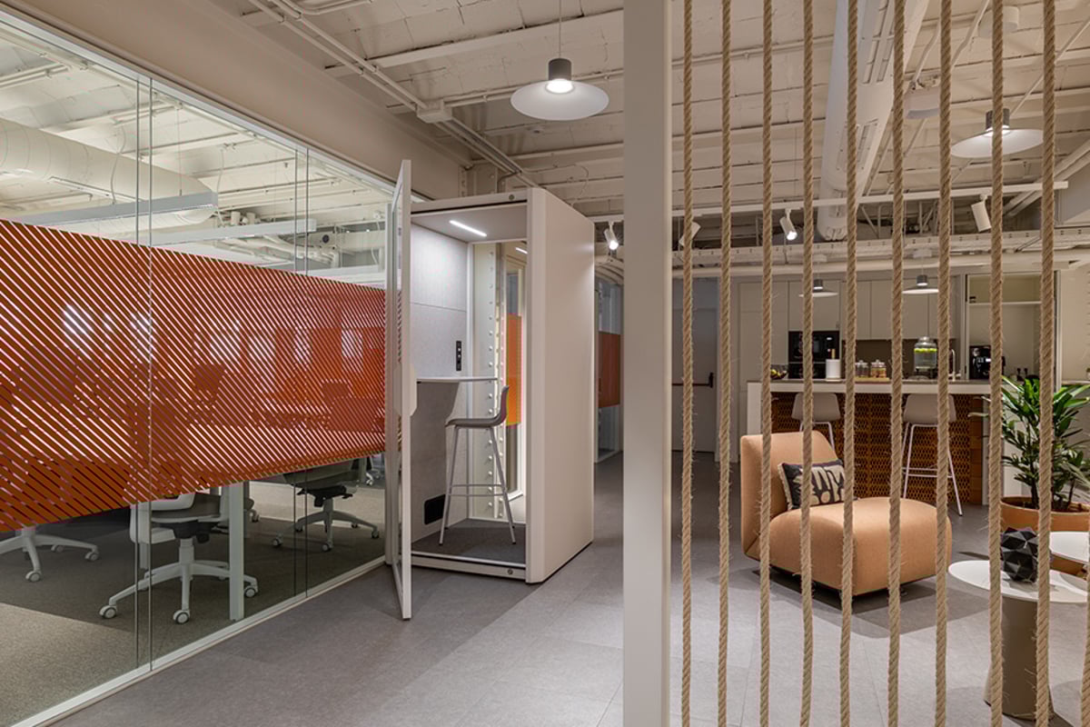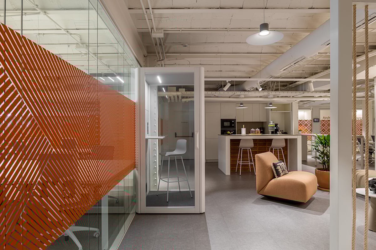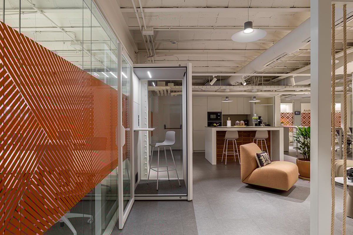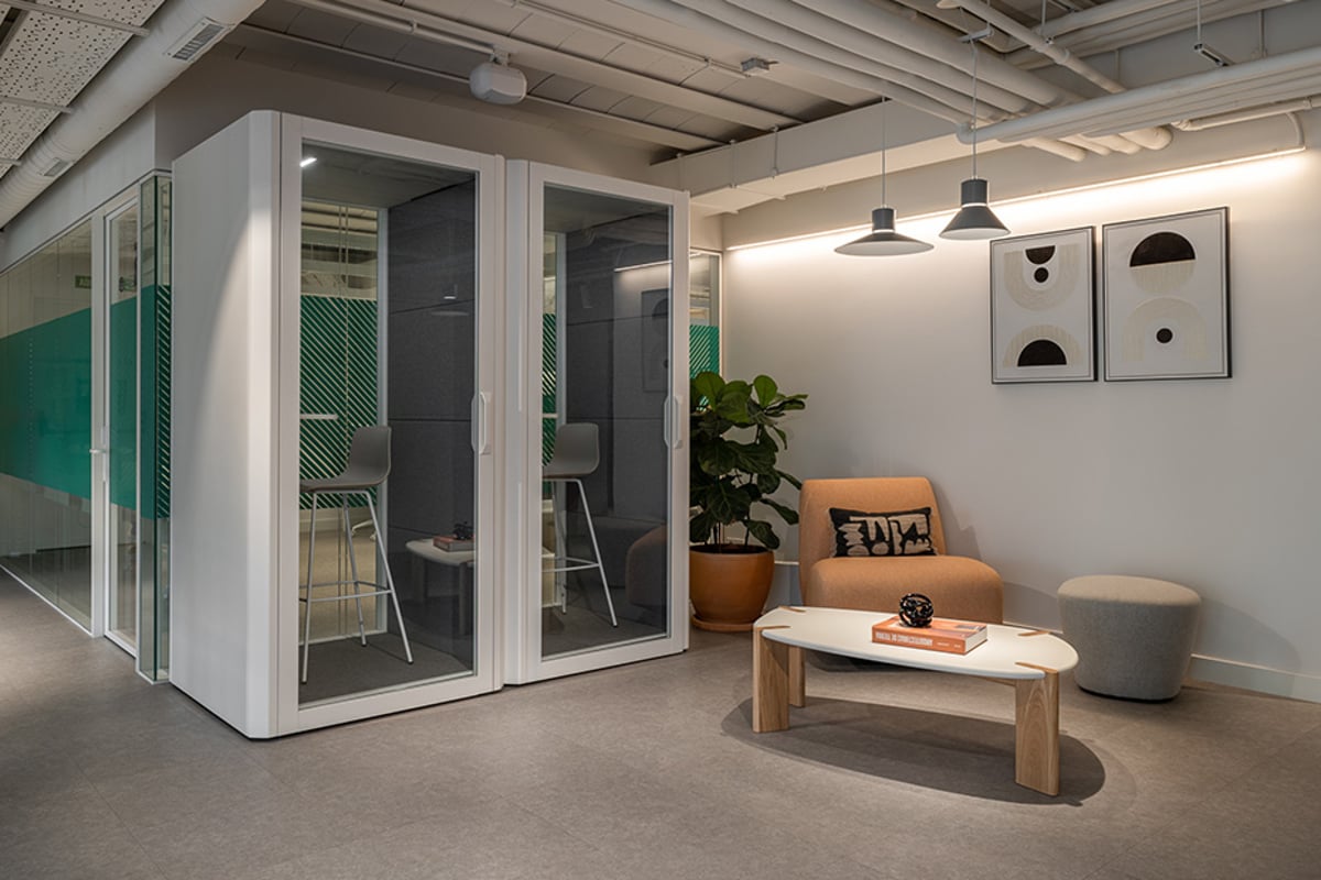 Actiu worked hand in hand with Elena Álvarez of LOOM to design the best way to install its Qyos 100 cabins in an already 'consolidated' and otherwise perfectly functioning space. With pre-assembled panels for quick installation and an integrated lifting and transport system that makes them easy to move, the Qyos 100 fit perfectly into the philosophy of a living space that is constantly on the move.