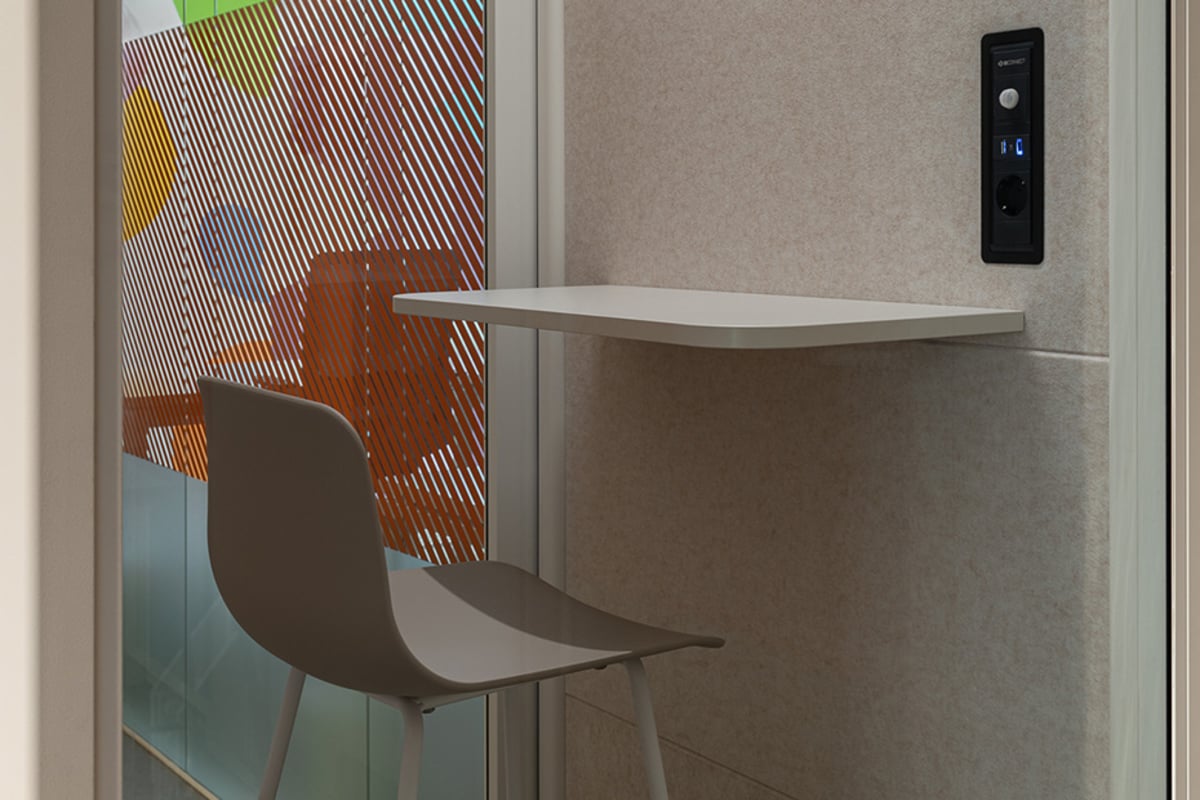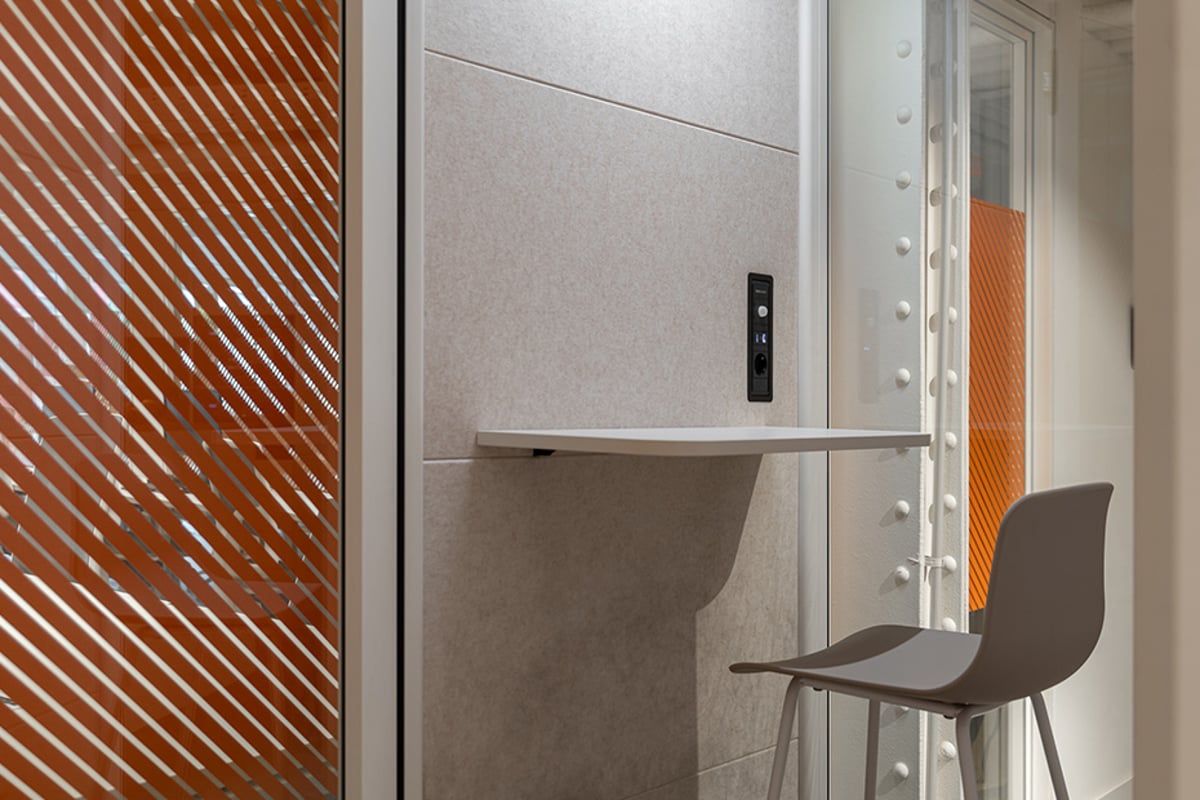 Located in the three-storey cores of the building, the Qyos 100 offer an individual, enclosed and acoustically isolated refuge for making calls, concentrating or enjoying moments of silence. A place designed, like the rest of the coworking, for the well-being and comfort of its users, where glass walls, ventilation, connectivity and LED lighting improve ergonomics and add comfort.