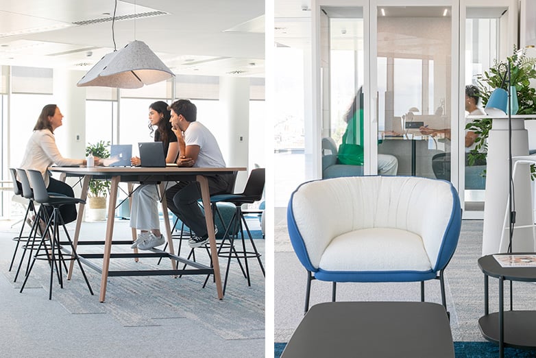 Lighting by Faro Barcelona and acoustic carpeting by Interface reinforce this atmosphere of comfort and efficiency, which is also enhanced by vegetation, acoustic control and environmental quality.