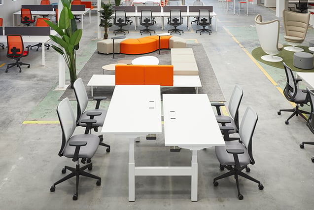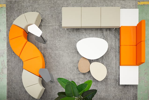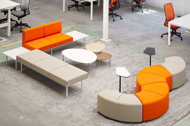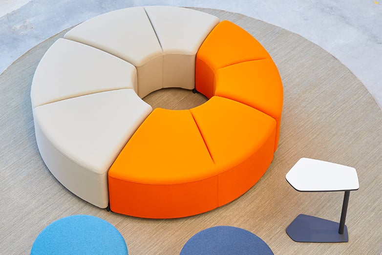 The Actiu furniture stands out from the moment you enter the space, with a waiting area located next to the entrance and equipped with a circular Bend module and two independent poufs that invite you into the space. Dyed in the brand's corporate colours and with a friendly design, the poufs provide extra comfort to a space where, as soon as you enter, you feel like staying.