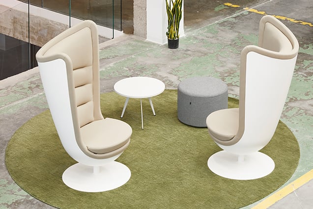 Another of the most unique spaces is the agile space equipped by Actiu so that it can be quickly redesigned. In it, two mobile Gradas, which serve as seats and incorporate a practical back for storage, are complemented by several poufs and two mobile Caddy 500 supports with a sound-absorbing upholstery that improves acoustics.