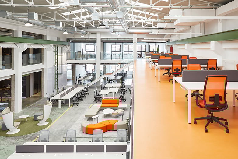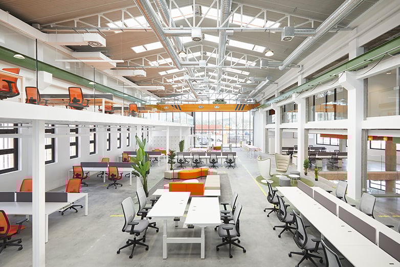 Inside, the large open-plan main space is divided into different areas where you can work individually or in groups, socialise, concentrate, or meet. Spaces with their own personality but which form part of a whole, where work areas, offices or meeting rooms coexist alongside collaborative and meeting areas.
