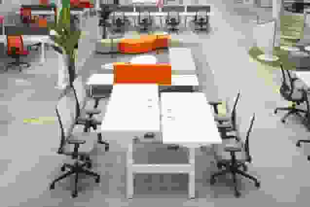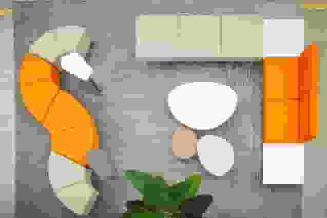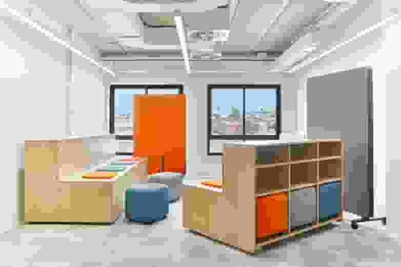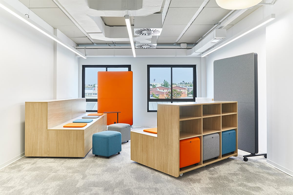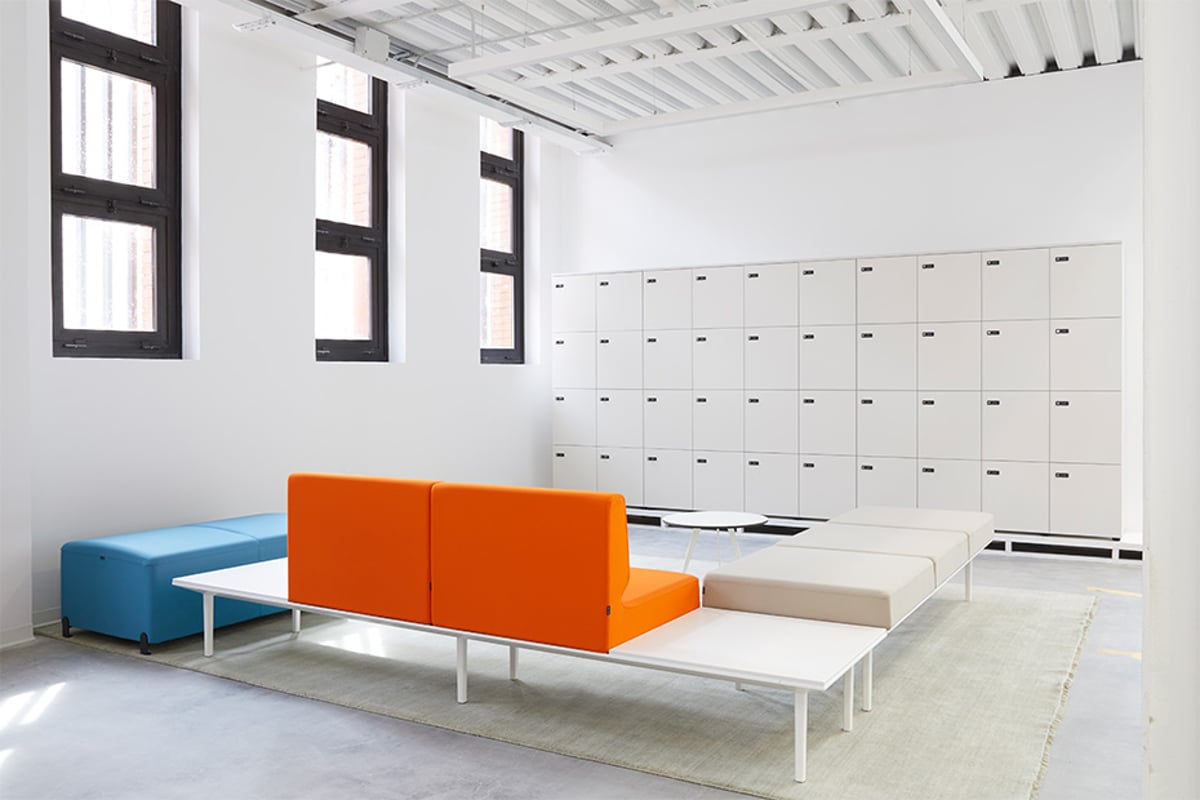 The Actiu furniture stands out from the moment you enter the space, with a waiting area located next to the entrance and equipped with a circular Bend module and two independent poufs that invite you into the space. Dyed in the brand's corporate colours and with a friendly design, the poufs provide extra comfort to a space where, as soon as you enter, you feel like staying.