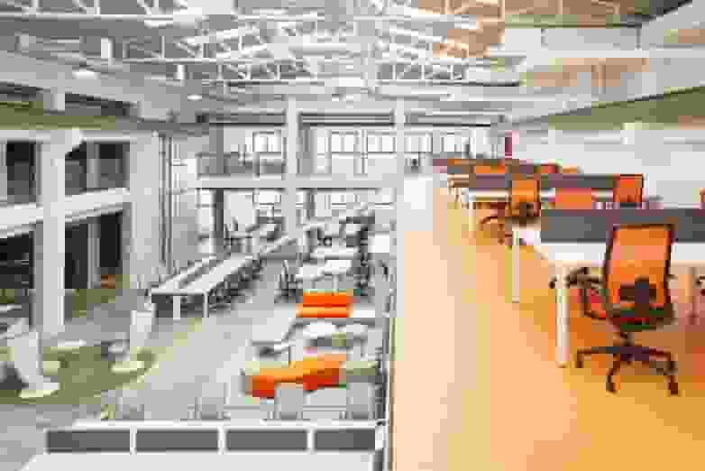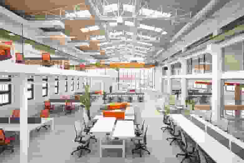 Original structures, such as the crane or the ladders used by the operators to work on the upper parts of the machines, are combined with new additions, such as the curtain wall that allows natural light to enter, the socialising area, the raised platform that, taking advantage of the sheer height of the building, allows greater a density of people, or the polycarbonate boxes that frame the rooms that require more privacy.