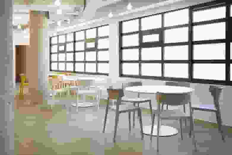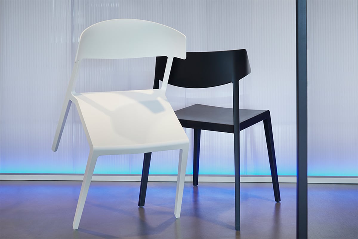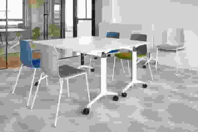 Functional furniture has been chosen for the office area, with timeless and light Tabula tables in white and Wing chairs in polypropylene in different colours that add liveliness. Stackable in groups of up to fourteen units, the latter can be stored when not needed, making it easy to change the layout of a space that, like the rest of the coworking space, stands out for its great flexibility and adaptability.