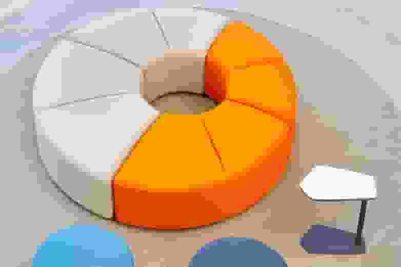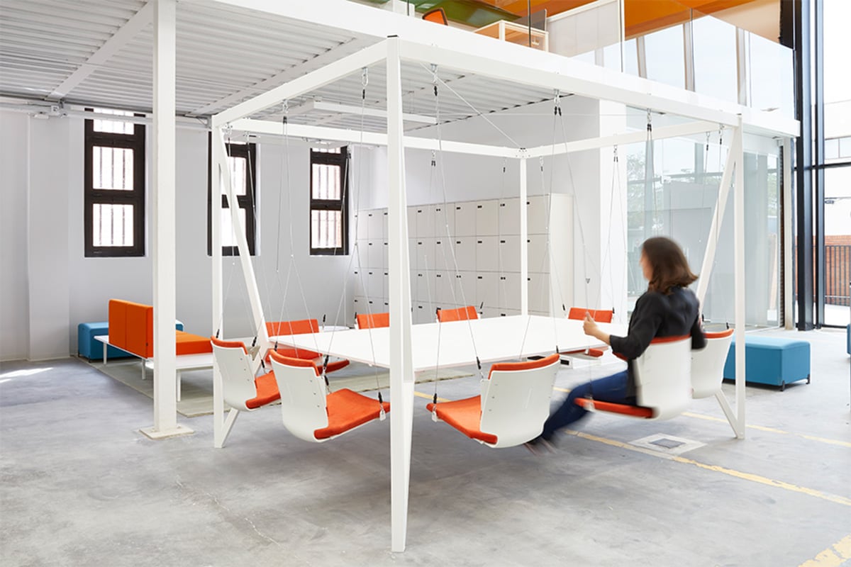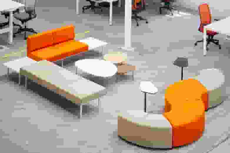 The operational areas alternate with meeting areas equipped with soft seating, benches and even an original table with ten swings for brainstorming sessions. All of them allow workers to meet, socialise or simply rest, sitting on the sinuous Bend modules or on the more rectangular structure of Longo.