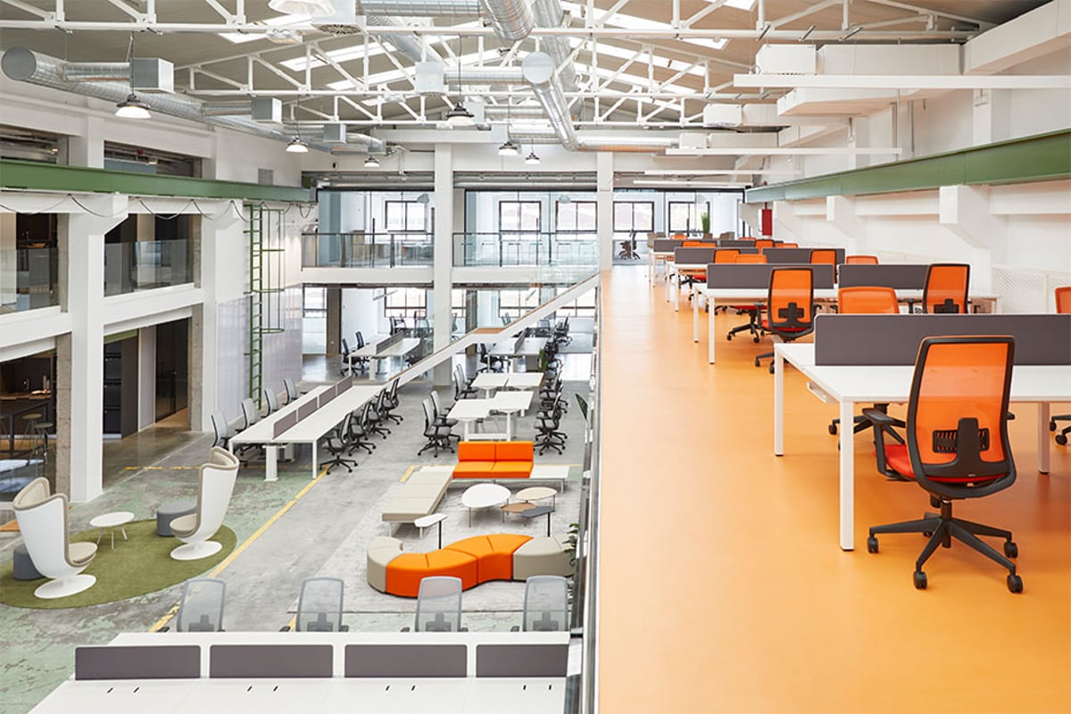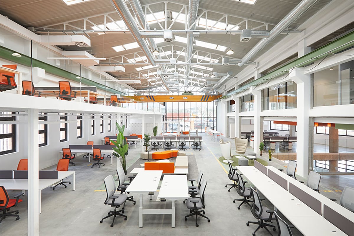 Inside, the large open-plan main space is divided into different areas where you can work individually or in groups, socialise, concentrate, or meet. Spaces with their own personality but which form part of a whole, where work areas, offices or meeting rooms coexist alongside collaborative and meeting areas.