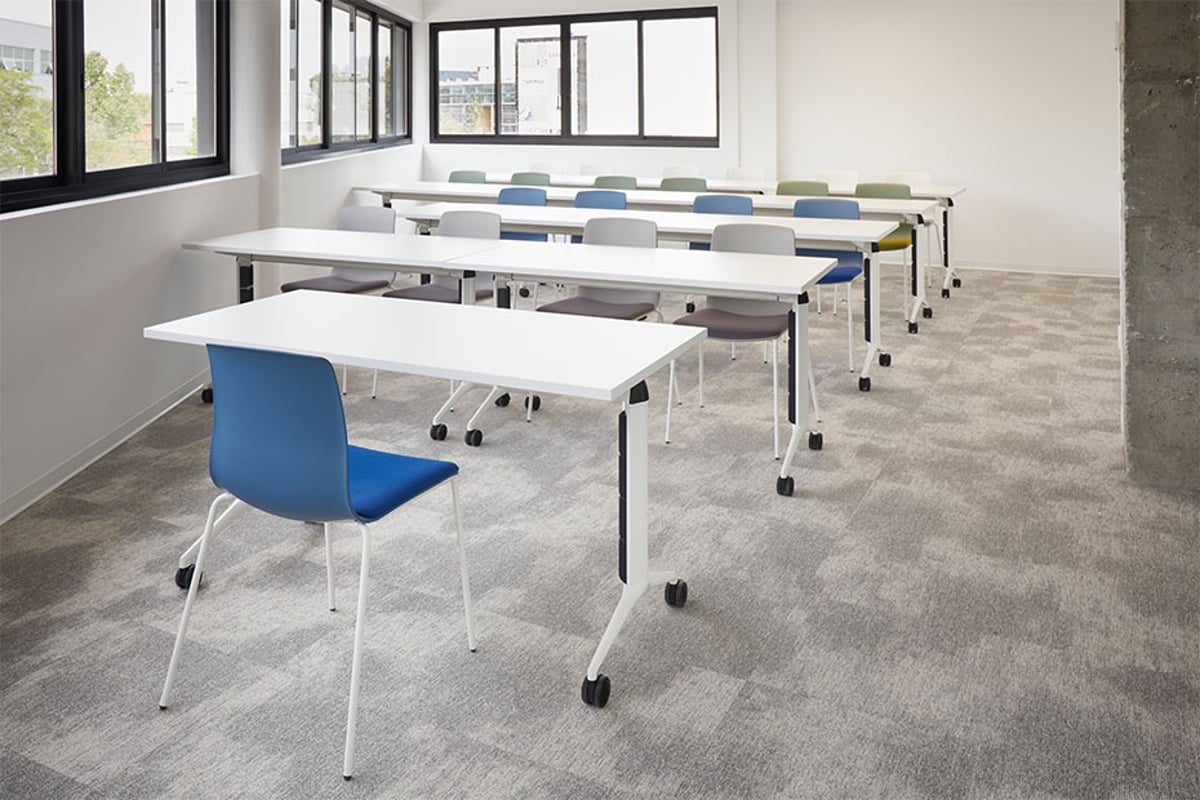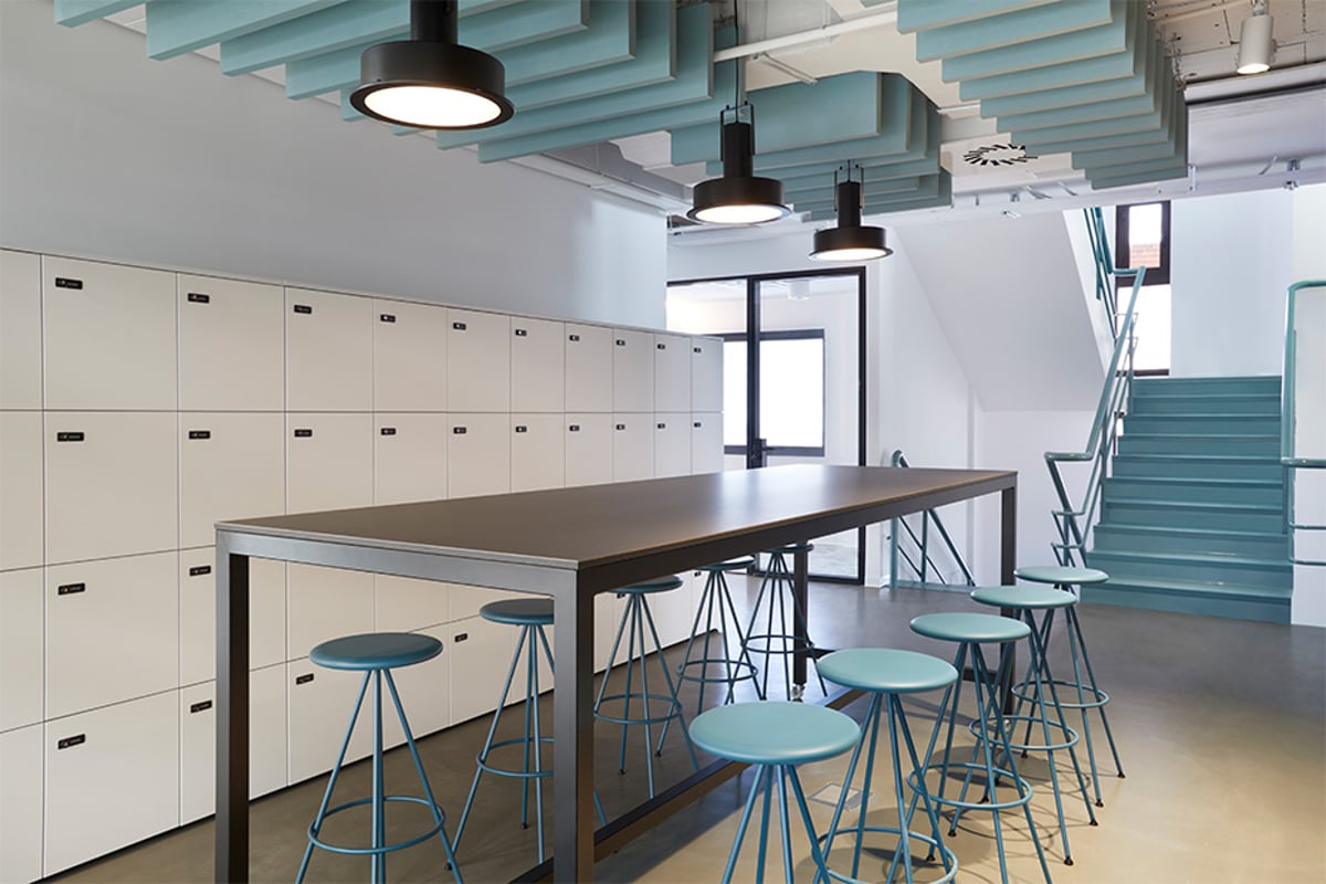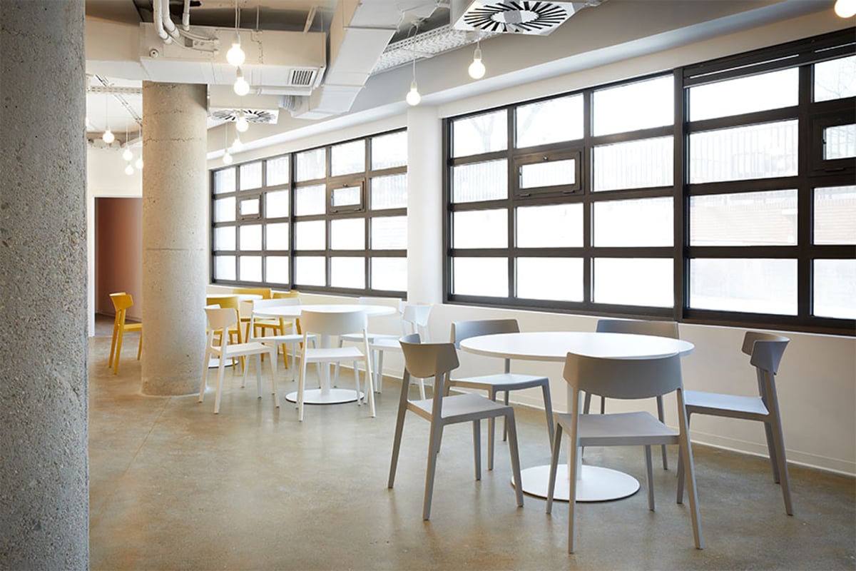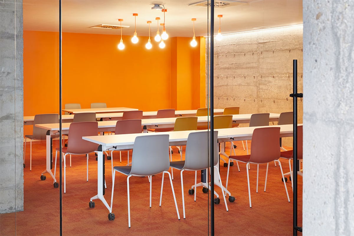 In order to offer its co-workers private areas where they can meet, make presentations, or receive training, part of the space has been designed to be more compartmentalised. This is the case of the meeting rooms, presided over by elegant Arkitek tables, some of which are accompanied by the versatile Noom 50 chairs with a four-spoke base; or those for training, where the same chairs, this time with a four-legged base, are combined with the Trama folding and height-adjustable tables in order to allow for greater versatility and agility of the space.