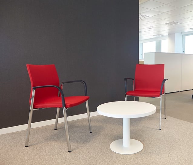 This has been a project where the details have been very well looked after, some specifically manufactured furniture to achieve the desired image. Thus, the supplements become particularly important. The tabletop screens, for example, are not only dividers but are also decorative, upholstered in the corporate colours (red, granite and beige) which standout in the room.