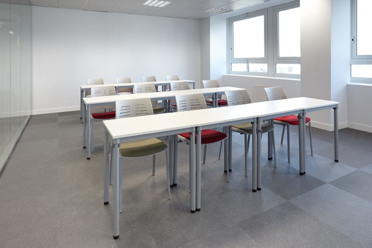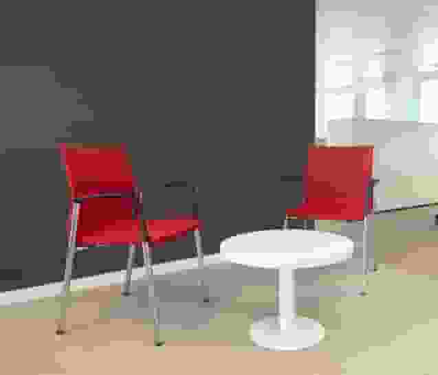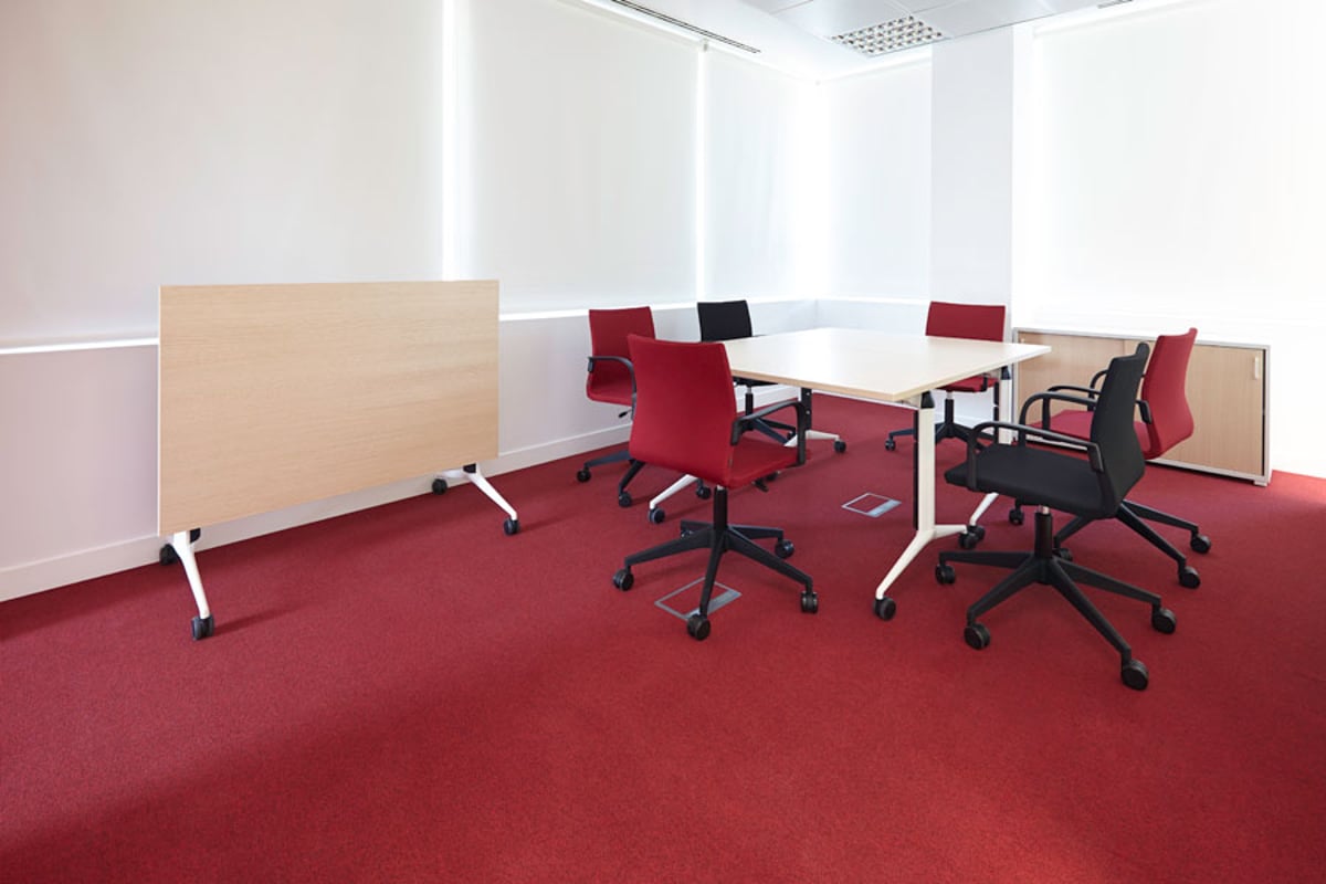 The Trama desk with castors and folding surface is ideal for multiple uses. It's great adaptability responds to the needs of the environment. In this case, a daring configuration has been opted for, in red and black, both in the flooring as well as the seating, the Uma model, with gas elevation and silent castors with rolling Teflon.