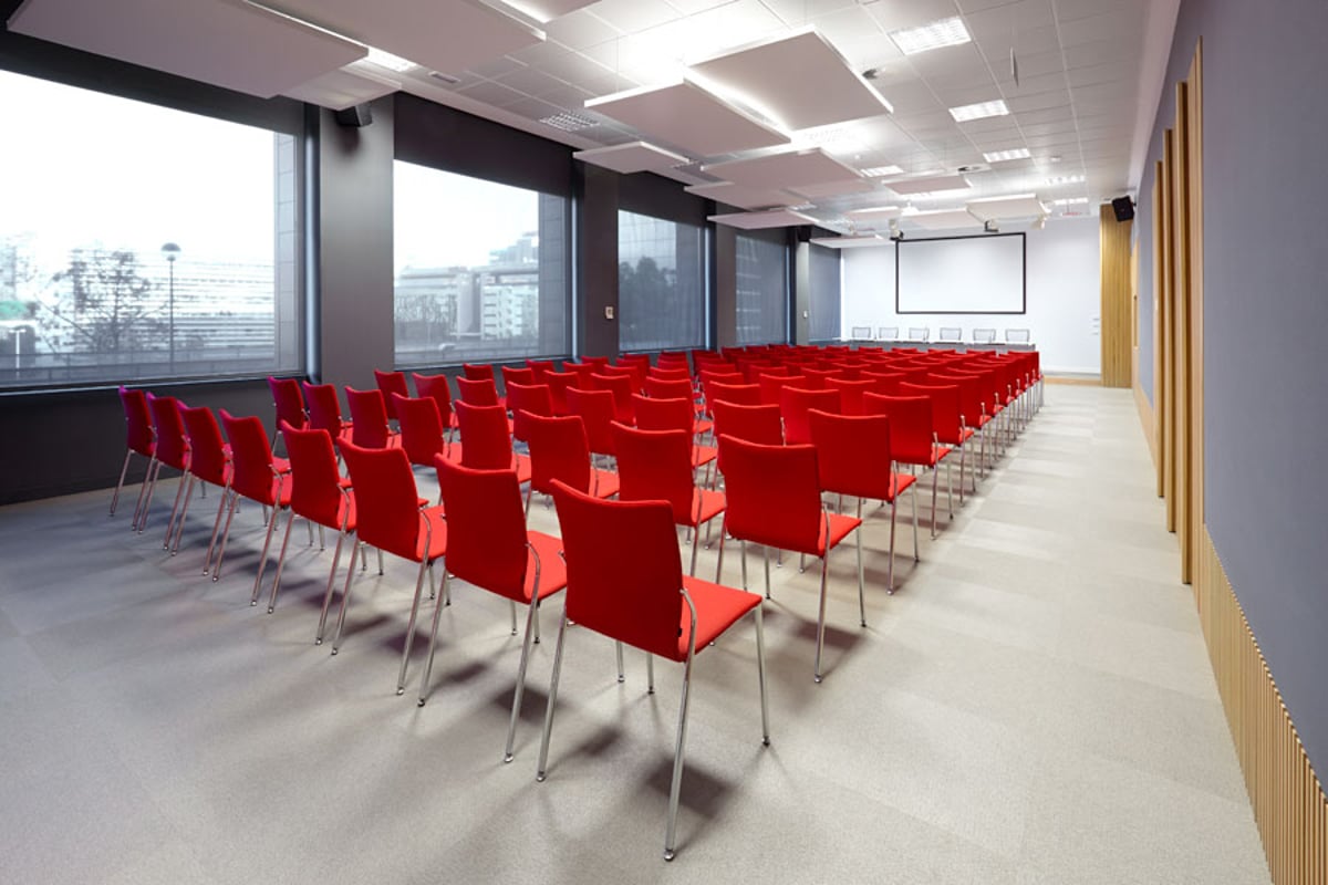 The Urban Plus 30 chair has been used in black, with its back made of technical fabric and aluminised tapered legs in the spaces designed for meetings and for the visitor. Its discreet style and elegant presence complements the comfort which is provided by its interior steel structure covered in moulded foam.