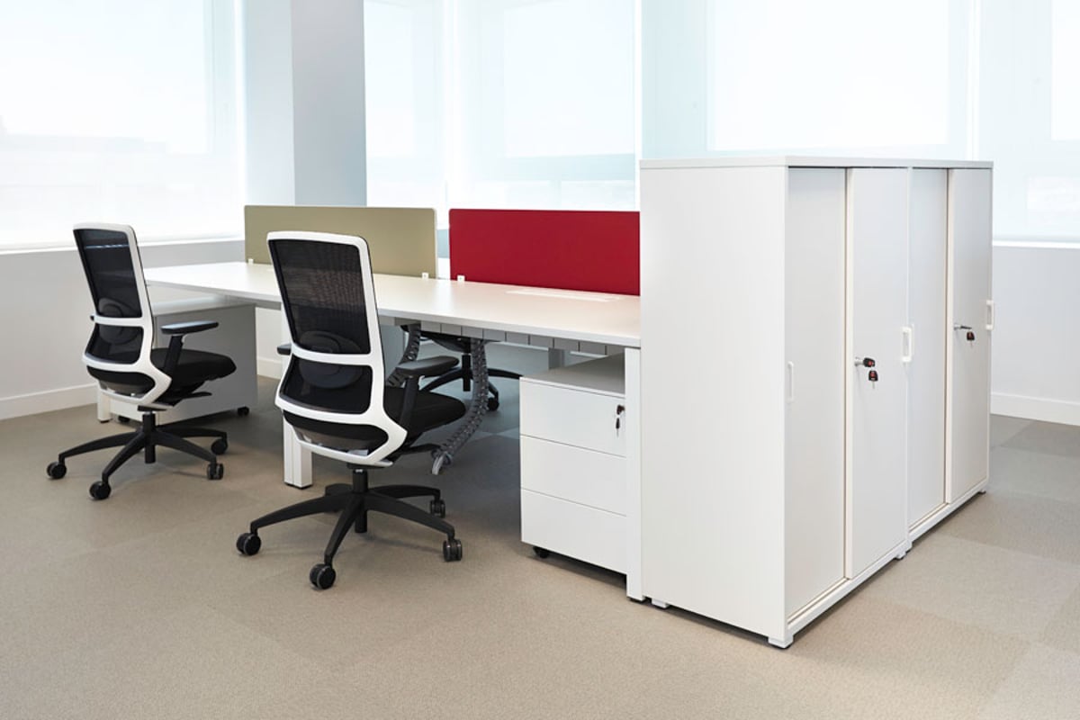 The desk program Vital Plus ST, elegant, sober and functional, adapt themselves perfectly to the needs of each configuration, management desks, twin desks, meetings etc. The seductive Tnk 500 with its back made of technical fabric, regulated lumbar support and patented revolutionary anti-return synchro mechanism, guarantees user ergonomics and comfort.